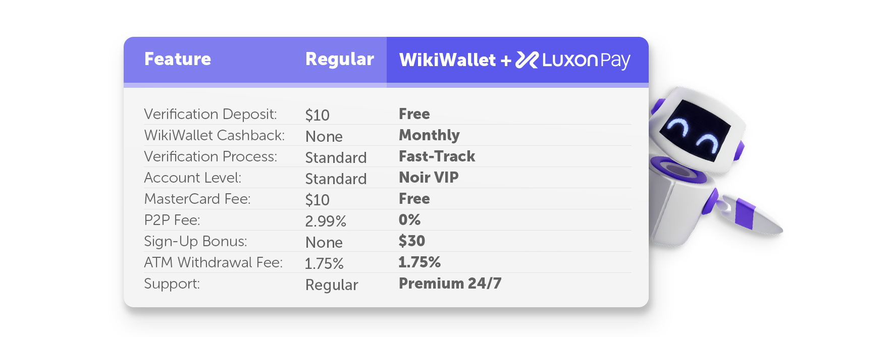 Connecting your verified LuxonPay account to WikiWallet gives you conditions that regular users do not receive. These include faster handling, better fees, and a simplified path to VIP Noir.